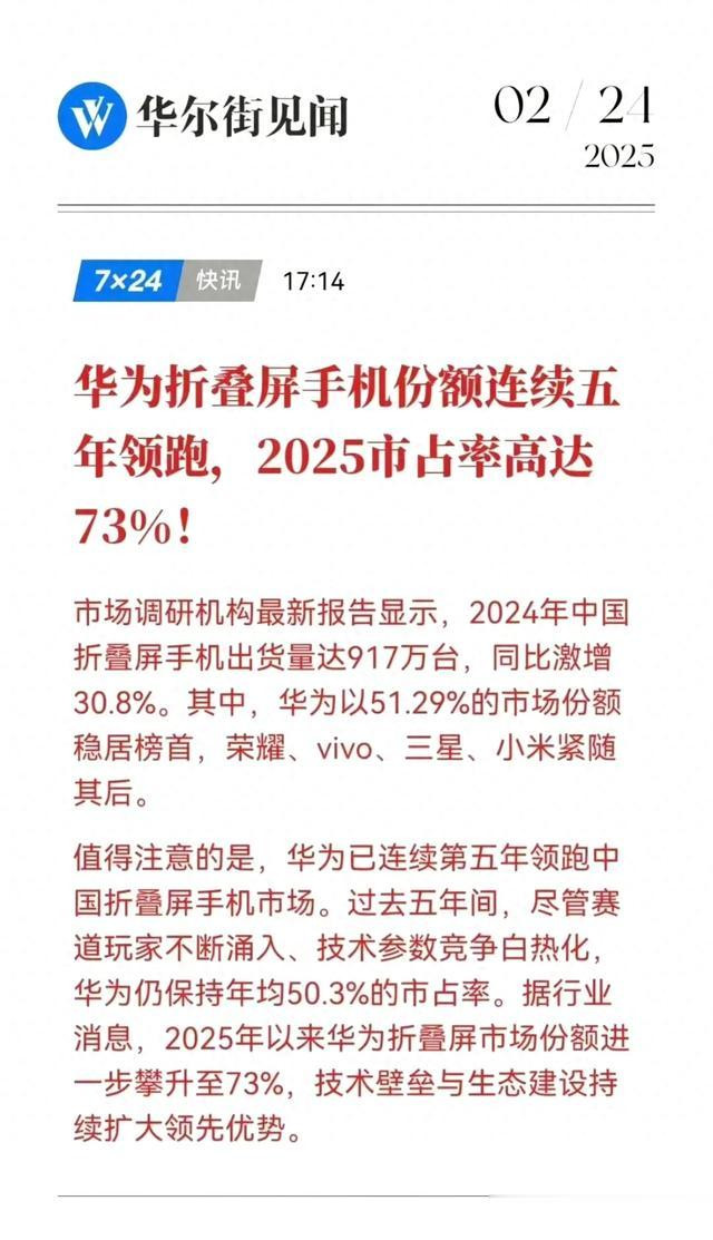 这场由华为主导的折叠革命,不仅改写着中国手机市场的权力版图,更在全球消费电子领域树起"创新中国"的标杆。当73%的市占率背后,是每年超百亿的研发投入和全产业链的垂直整合能力,这场高端突围战早已超越产品竞争,升维为科技生态体系的终极对决。